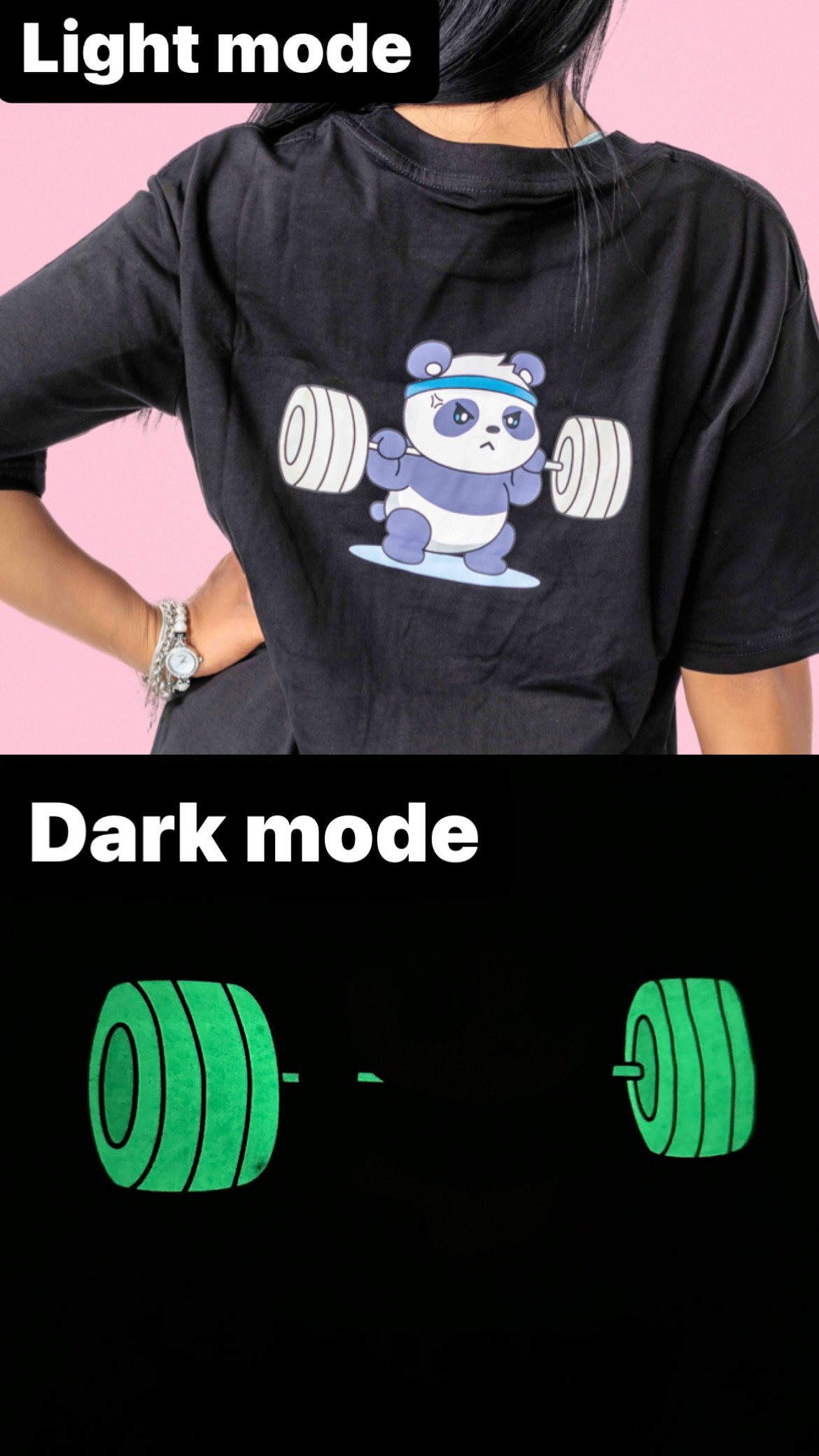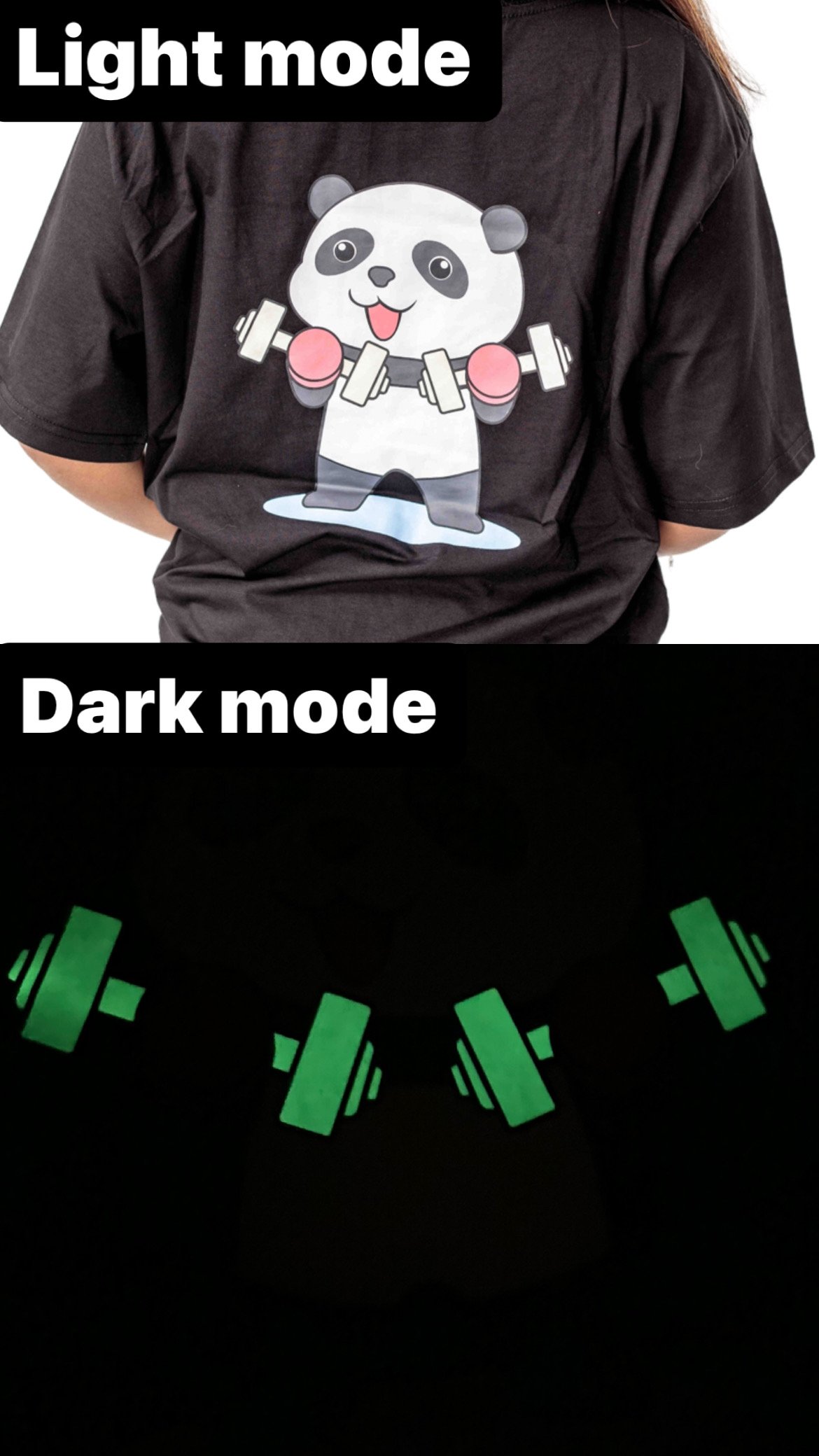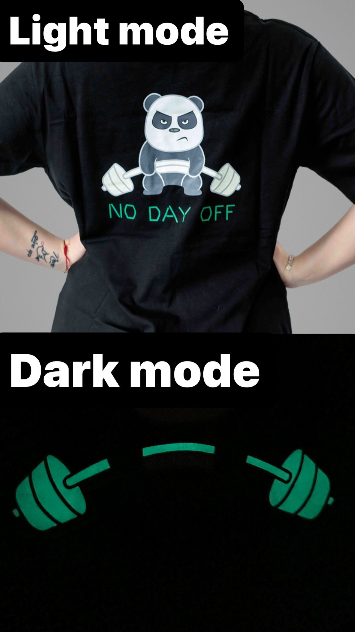 But what truly sets this oversized t-shirt apart is its attention-grabbing glow-in-the-dark print. The vibrant design is meticulously applied using high-quality, non-toxic glow-in-the-dark ink. During the day, it stands out as a stylish and energetic graphic, inspiring confidence and motivation. When the lights dim, however, the print comes alive, emanating a luminous glow that adds an electrifying element to your gym routine.